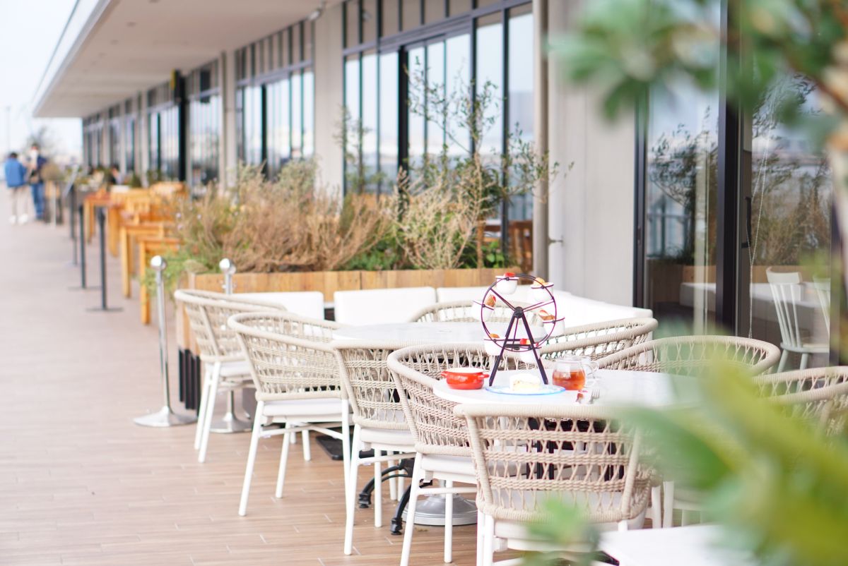 そしてテラス席からは横浜の海とみなとみらいを代表する景色が一望できます。この景色が見られるだけでもうれしいポイントですよね!ディナータイムの夜景も絶景です。