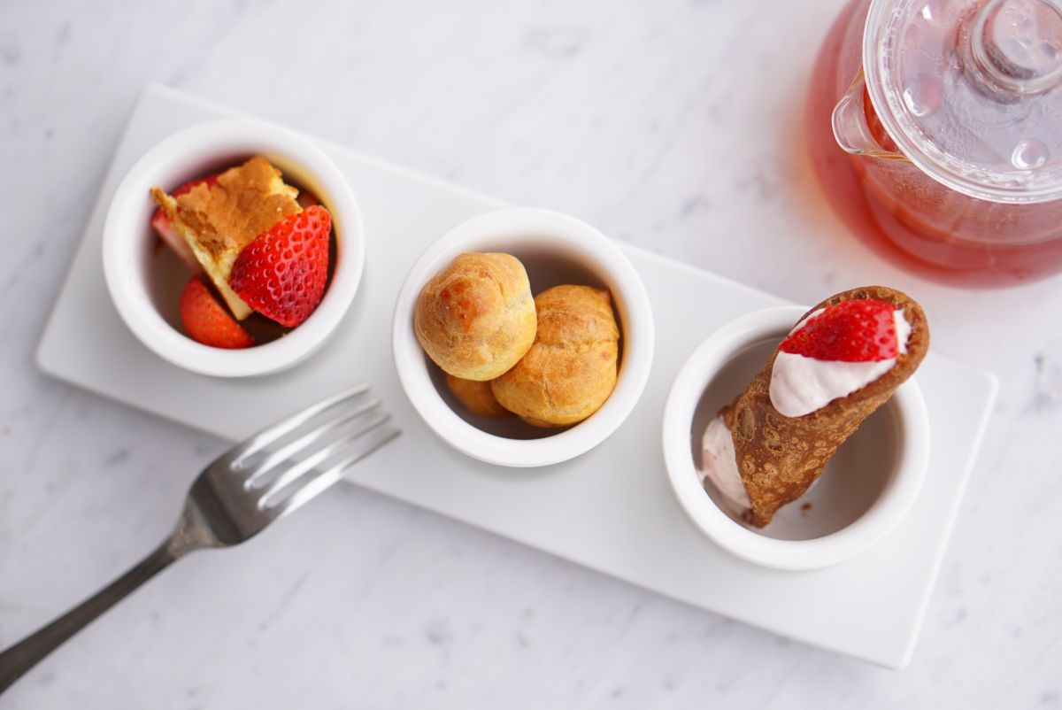 食べるときは写真のようなプレートでいただきます。左からカットチーズケーキ、プチシュー、シチリアの伝統菓子であるカンノーロ。内容は時期によって多少異なりますが、撮影時である3月にはイチゴが添えられていました。ひと口サイズなので食べやすく、食後のデザートに最適ですよ!