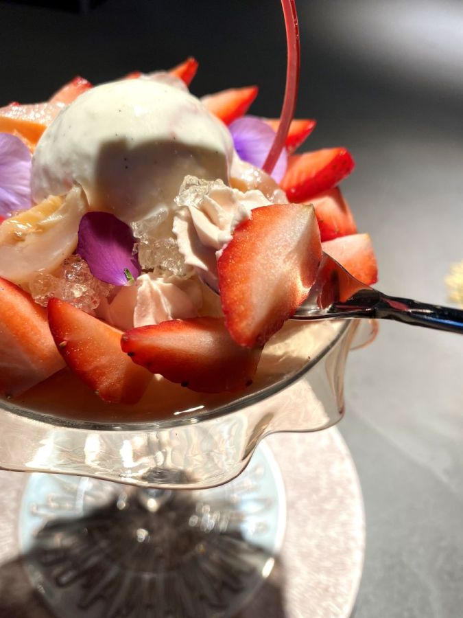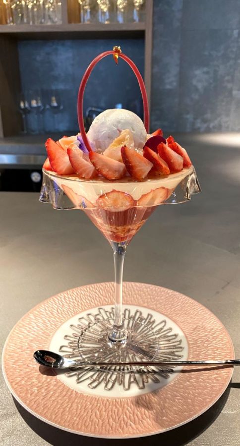 早速食べ進めてみると、甘さが際立つパフェではなく、それぞれの素材を引き立てた大人の味わいのパフェ。甘さと酸味のバランスのよい国産イチゴがふんだんに散りばめられ、ライチとの相性も抜群です。イチゴミルククリームやアイスはミルク感がしっかりとあり、質のよさを感じられます。またビールを使ったイチゴジュレや、イチゴとビールコンフィなど、ビールをアレンジした具材もアクセントに。ひらひらジュレは求肥のようなもちもちとした食感が印象的です。