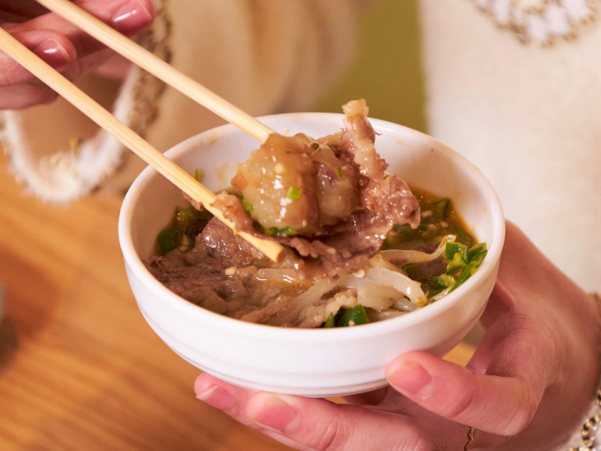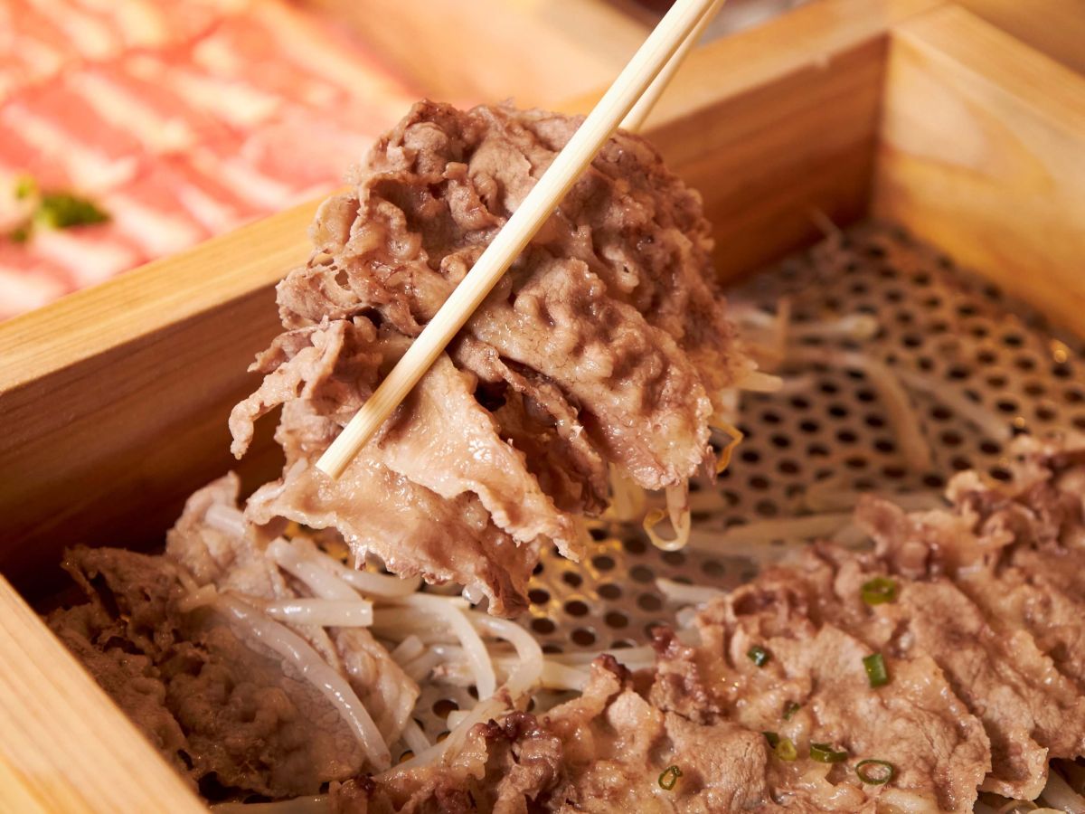 こちらが名物の「牛サムギョプサル」です!サムギョプサルといえば、一般的に“豚バラの三枚肉”の焼肉を指しますが、ここ「9''36 ギュウサム」では、薄切りの牛バラ肉を使っていて、さらにヒノキのせいろで蒸すスタイルを採用しているんです。