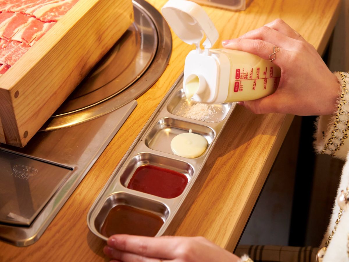 先ほどの5種類のソースのほかに、実は「牛サムギョプサル」をさらにおいしく味わうための新ソースが開発されました。それがこの「カンジャンセウソース」。エビの甘みをベースに、韓国のしょうゆを使用したオリジナルのタレなのですが…、その詳細や配合については、企業秘密なのだとか。