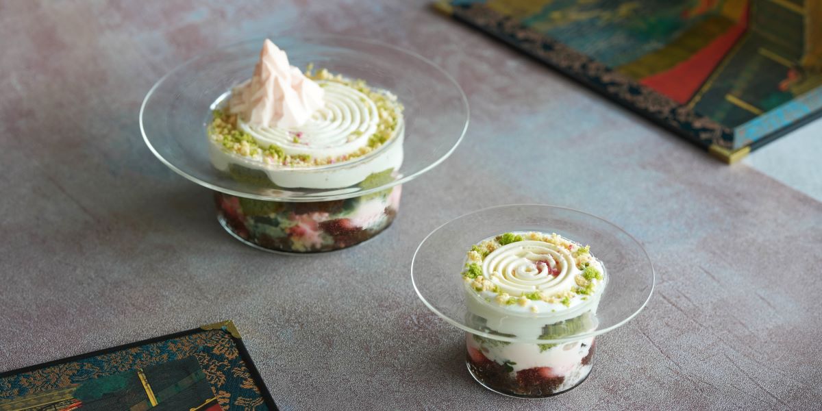「雲上茶寮」で販売されるカフェスイーツは、『源氏物語』がコンセプトとなっています。「庭園パフェ - 桜の州浜 -」は「源氏物語ミュージアム」のエントランスガーデンや平安時代の州浜をイメージしたボウルパフェです。