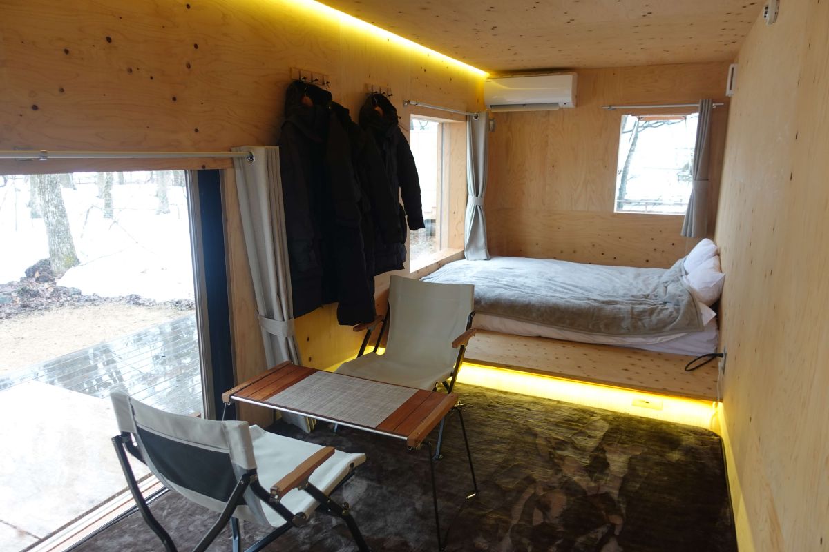 ちなみに、室内には冷蔵庫や暖房、ケトルなども完備されていて、いわゆる一般的なホテルの滞在と同じように快適に過ごせるのですが、スノーピークならではのものも置いてあります。