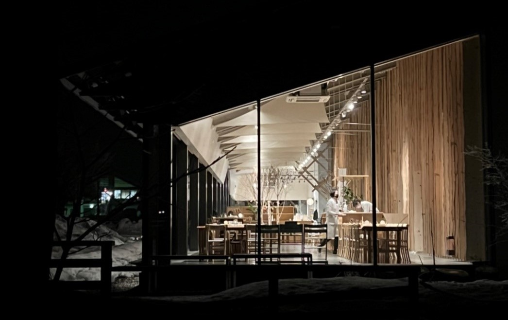 ちなみに、内から見た外の景色はもちろんのこと、夜は外から中を見ると、本当に美しいので、ぜひ目に焼き付けてください!この空間が、ステージのようにぱっと照らしだされる姿に、うっとりしてしまいました。あたたかな照明の色合いも素敵です。