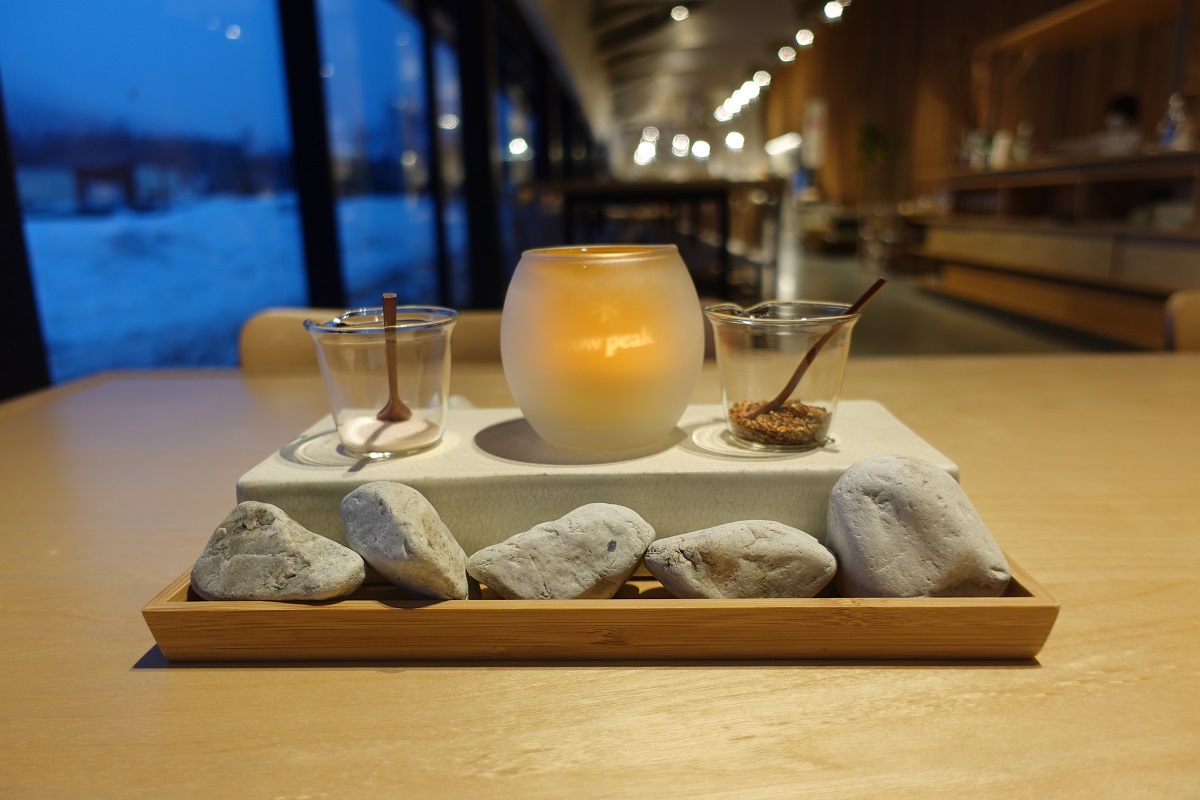 ディナーの席に着くと、まず置かれていたのがこちらのキャンドル。このオレンジの暖かな光にほっこり癒やされたのと、石も含めて、キャンプで食事をとっているかのように感じられたのとで、テンションが上がりました。素敵な演出!