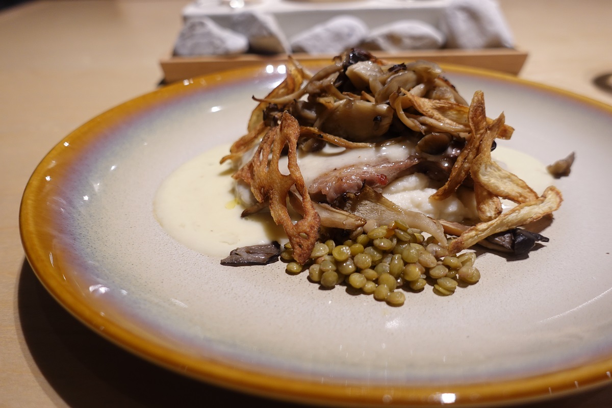 メインは、「信州美雪 ポークロースの溶岩グリル フォンデュータ 黒トリュフオイル」をチョイス。肉厚のお肉に、クリーミーなチーズと、アクセントに香り高い黒トリュフのオイルがかかっていて…キノコ類との相性も抜群でした。