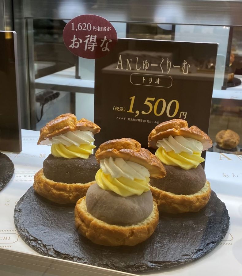 そしてもうひとつの特徴は、「ANしゅーくりーむ」と「ANプリン」の餡子の糖度が3種類から選べることです。糖度60度の「つぶあん」486円、糖度52度の「こしあん」、糖度45度の「皮むきあん」からチョイスすることができます。「ANしゅーくりーむ」は3つをセットで買うと1500円とお得に!