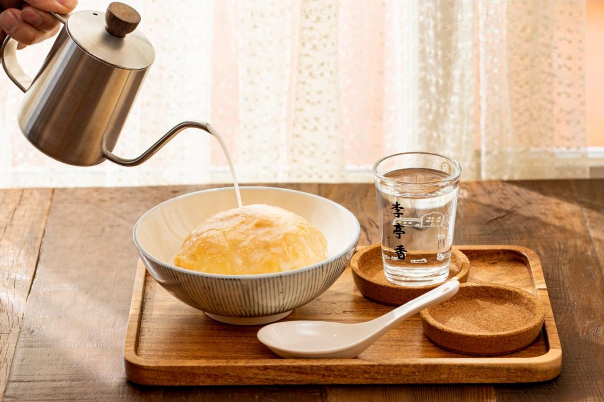 「甘いものが苦手」という友達やパートナーは「手沖泡餅」がおすすめ。麦芽糖を仕込んだ中華パイに熱々のアーモンド茶を注いでいただきます。さっぱりとした無糖のアーモンド茶がパイにほろほろと染み込み、昔懐かしいほっこりとした味わいです。