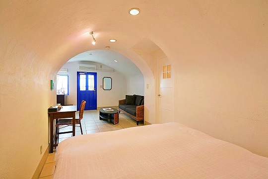 オーシャンビューの美しい部屋は、かつてサントリーニ島で交易船のクルーたちが暮らした洞窟型住居をイメージした造り。アーチ型の天井や真っ白な壁、細かい調度品など細部までこだわりが伝わってきます。