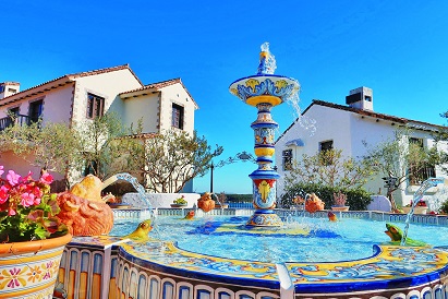 白い街並みを再現した中庭には、南ヨーロッパにありそうなタイルづくりの噴水が。青空とのコントラストが美しく、映えもばっちり!