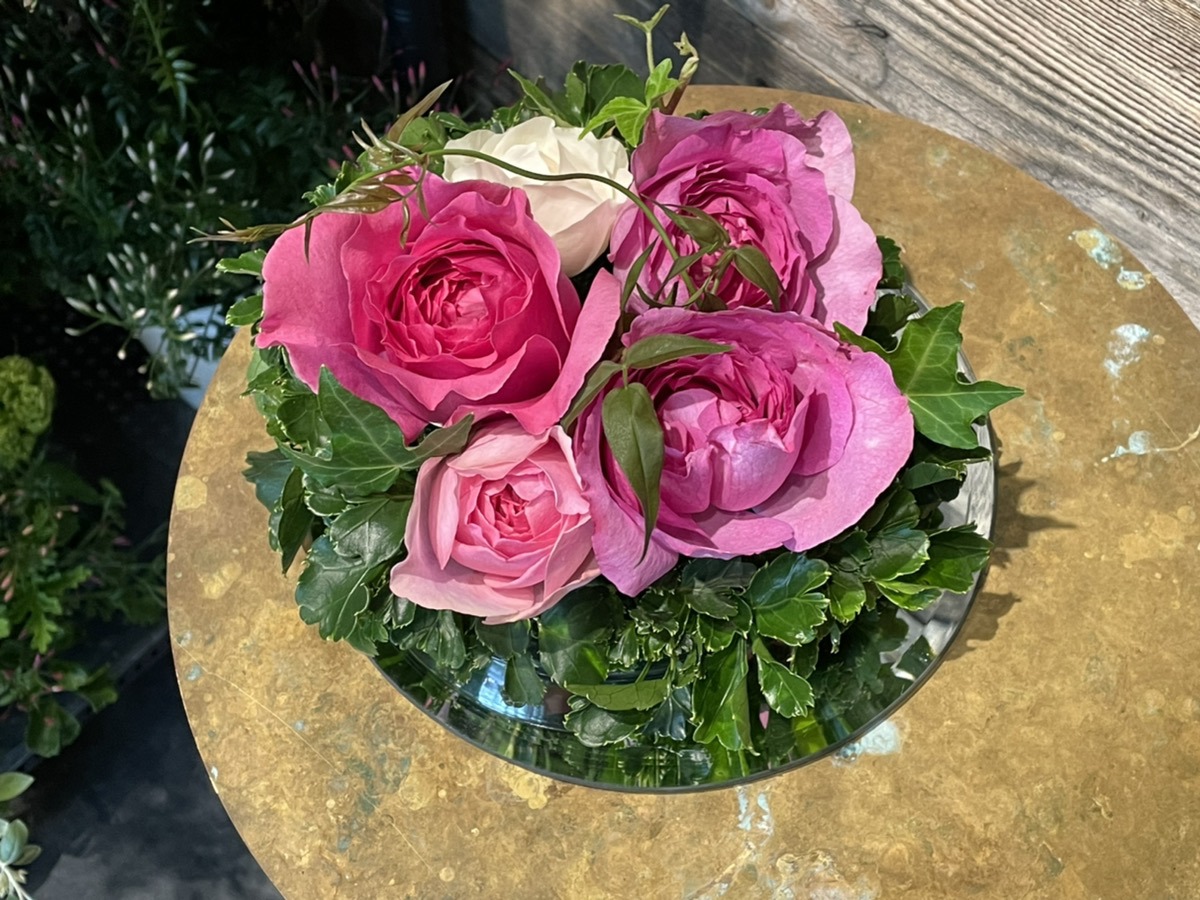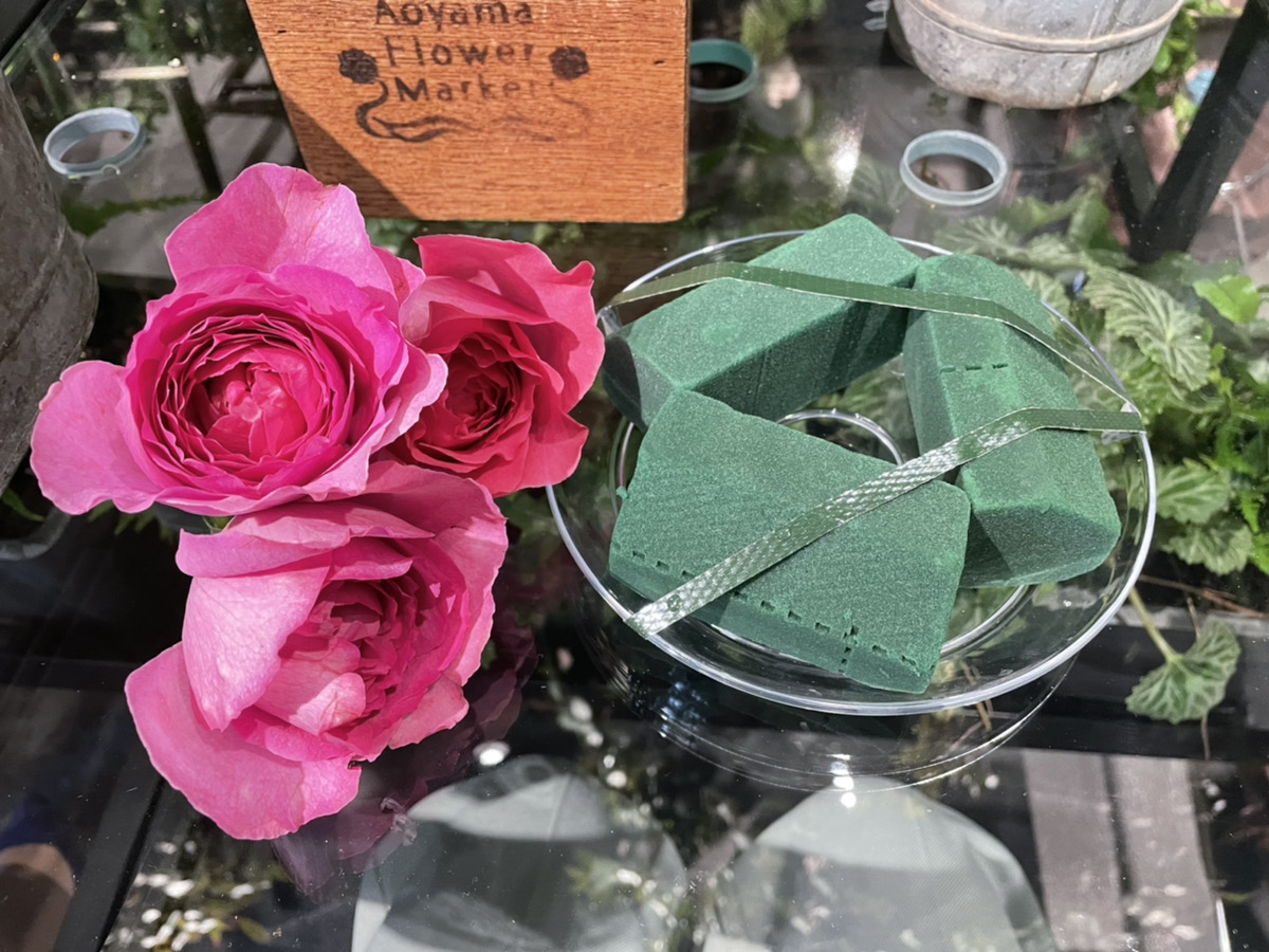香りの強い4種類のバラと3種類のグリーンをお皿にのった緑のスポンジに挿していきます。触れるたびにバラが香るので、レッスンを受けているのに「ああ、いい香り…!」とついつい手を止めてしまいそうに。