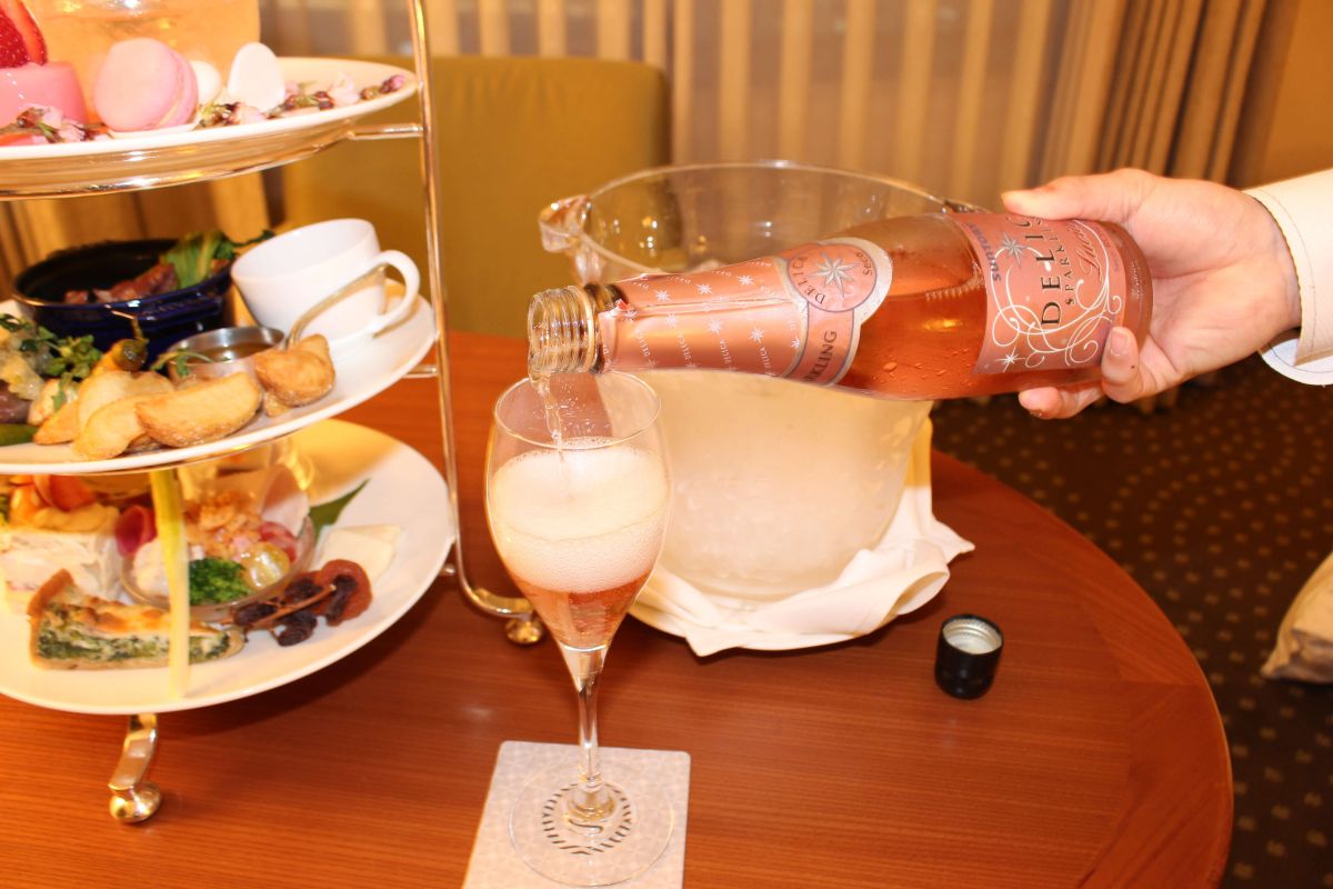 「ベイ・ビュー」の食事ではフリーフローが楽しめますが、お部屋での食事の際はこちらのロゼスパークリングワインのハーフボトル1本が付きます。春らしいピンク色がかわいらしく、ハイティースタンドと並べても写真映えしそう!ほんのり甘みを感じる飲みやすいスパークリングです。