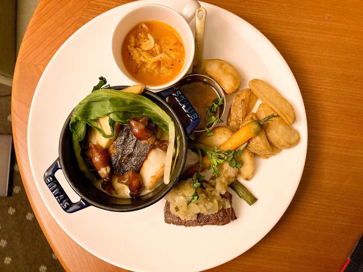 2段目はメイン料理のお皿。ホテルのフレンチレストランが手がける本格メニューとあって、期待も高まります。