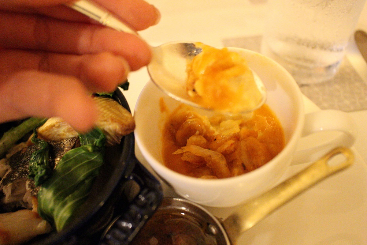 その横には桜エビがサクサクとしていて香ばしい「桜エビのヴルーテ 新玉ネギのロワイヤル」が。ヴルーテとはルーをブイヨンでのばしたフレンチのソースで、ビスクのような濃厚な味。桜エビの下には洋風の茶わん蒸しのような食感の新タマネギのロワイヤルが隠れており、全体的になめらかでとろけるような食感です。