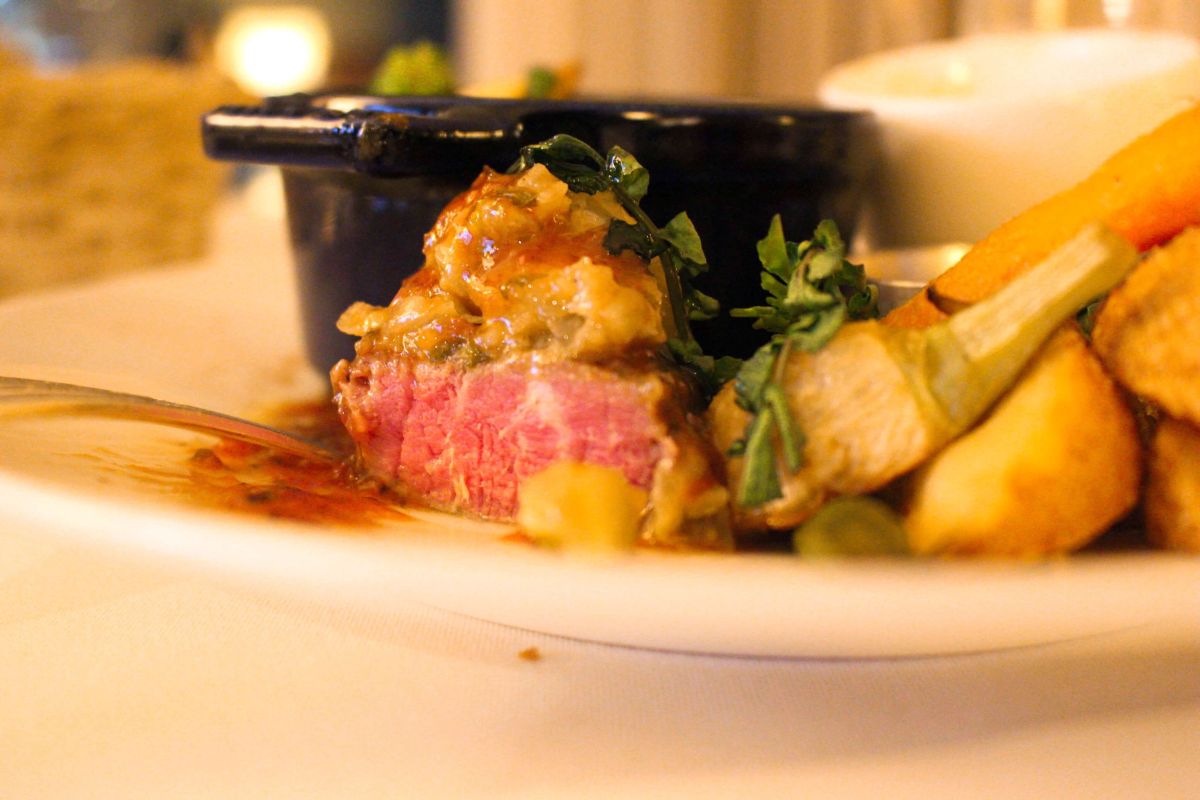 メインの牛フィレ肉は、タマネギのソースをかけていただきます。ナイフを入れて食べてみると、驚くほどの軟らかさ!ソースはタマネギの甘さを極限まで引き出したようなソースで、しっとりした肉質との相性もばっちりです。
