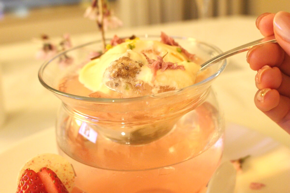 大きな透明の器に入った「桜のブランマンジェ」は、桜のジュレのやさしいほのかな甘みとイチゴのムースの酸味が混ざり合い、食事の後でもさっぱりおいしくいただけるひと品。食べ進めると、中にはサクサクのチョコクランブル、器の底にはコク深い抹茶のムースも出現!上にのった桜の塩漬けは甘いスイーツの合間の箸休めのような役割を果たしてくれて、味の変化も楽しめるデザートでした。