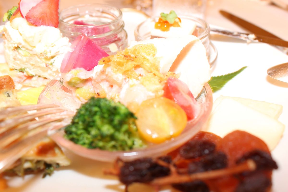 3段目のオードブルは、ホウレンソウとベーコンのキッシュ、スウェーデンのサンドイッチケーキ「スモーガストルタ」などが並びます。「スモーガストルタ」は上にはイチゴやサーモンも飾られ、丁寧に作られている様子が伝わります。瓶の中にはピンク色のタマネギが食感のアクセントとなった「鯛のタルタル」、分厚いぷりぷりのサーモンの下にバジルペーストが敷かれた「サーモンのショーフロア」が。ショーフロアはバジルの塩味があり、パンとの相性も抜群!