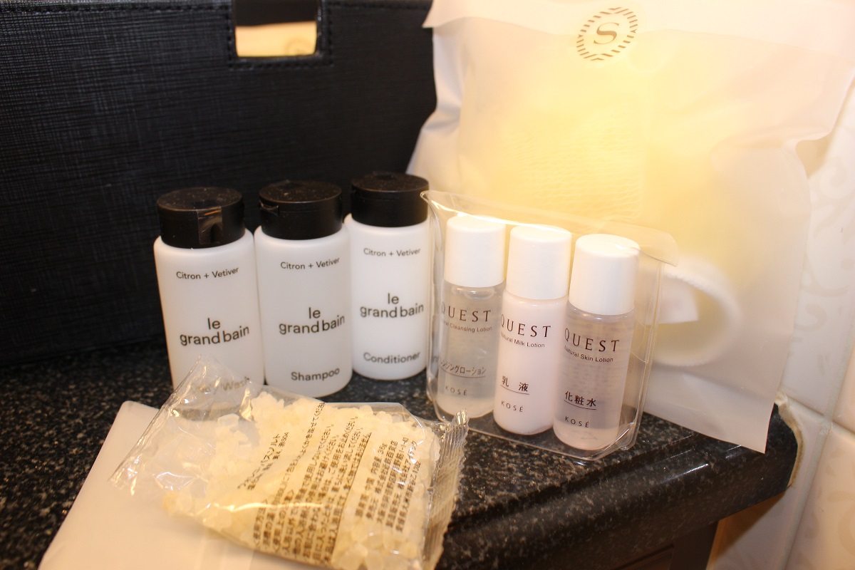アメニティはシャンプー、コンディショナー、ボディソープのほか、クレンジングや洗顔料、化粧水も置かれています。クレンジングがないホテルも多いので、とても助かります。また、体を洗う泡立てネットや入浴剤まで備えられています!入浴時間も至福の時間になる工夫が随所に見られます。