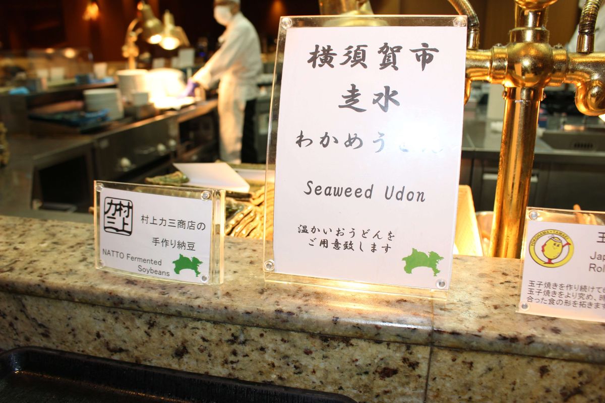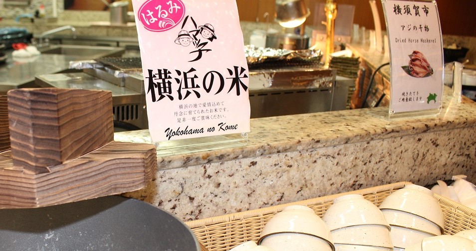 和食コーナーに行くと、よりたくさんの“神奈川朝食”がずらり。お釜で炊かれた横浜のお米や、その場で焼いてくれる横須賀市のアジの干物も発見しました。