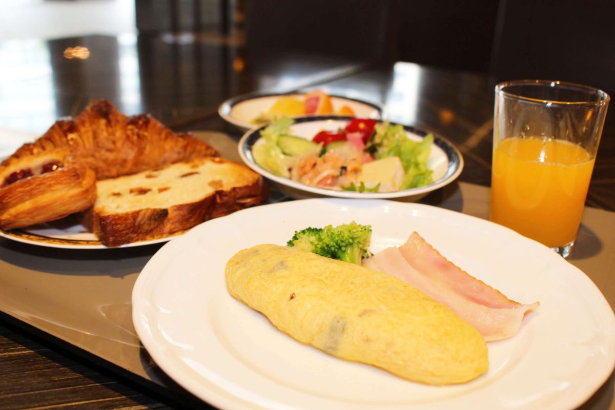 まずは“ホテルの朝食”らしいメニューからいただきます。パンとオムレツ、サラダ、フルーツの洋食メニューをピックアップ。トースターでリベイクしたクロワッサン、デニッシュなどのパンはサクサクです。