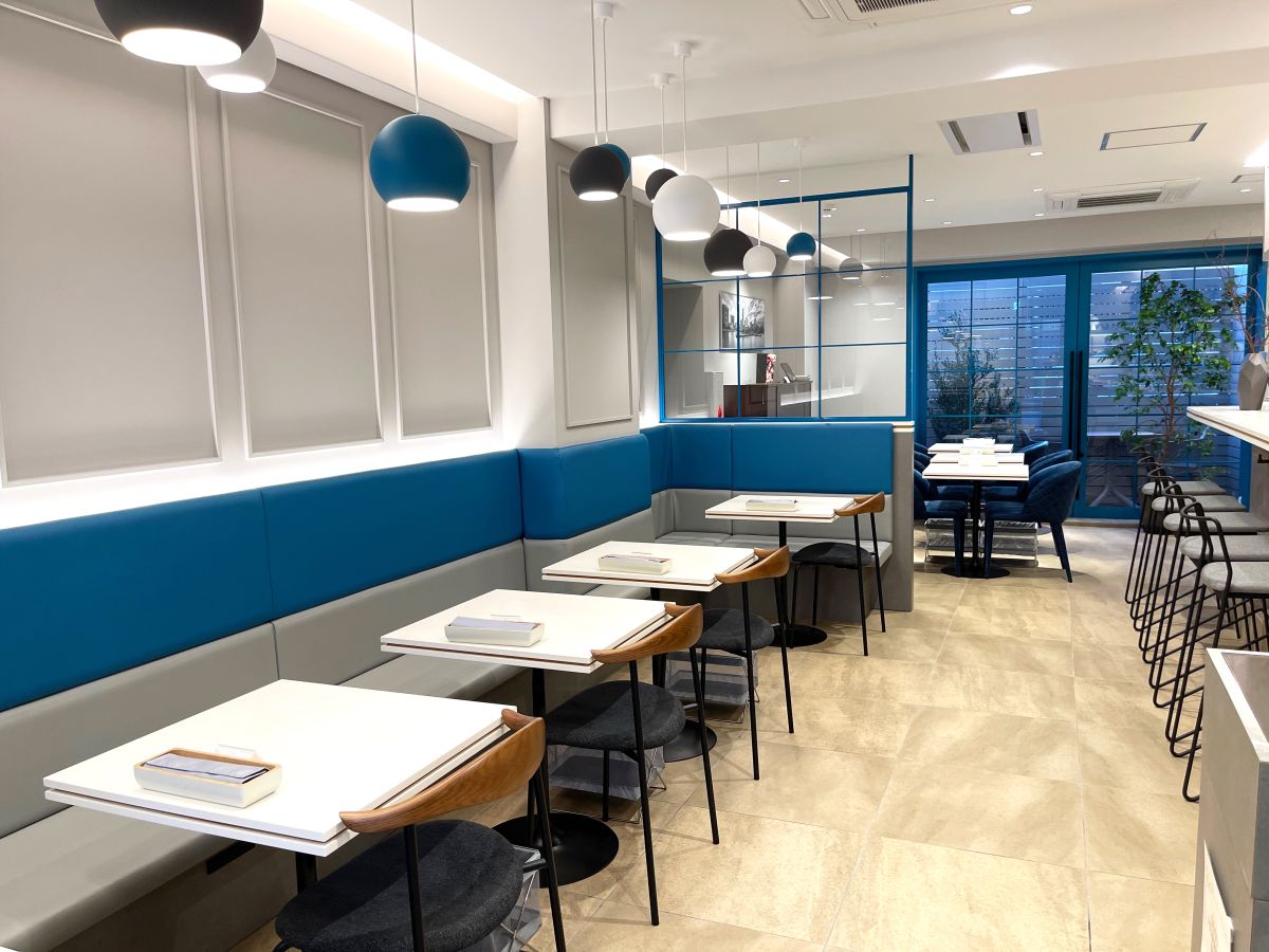 水の巡りを思わせる浅葱色を基調とした店内は、スタイリッシュでとてもおしゃれ。