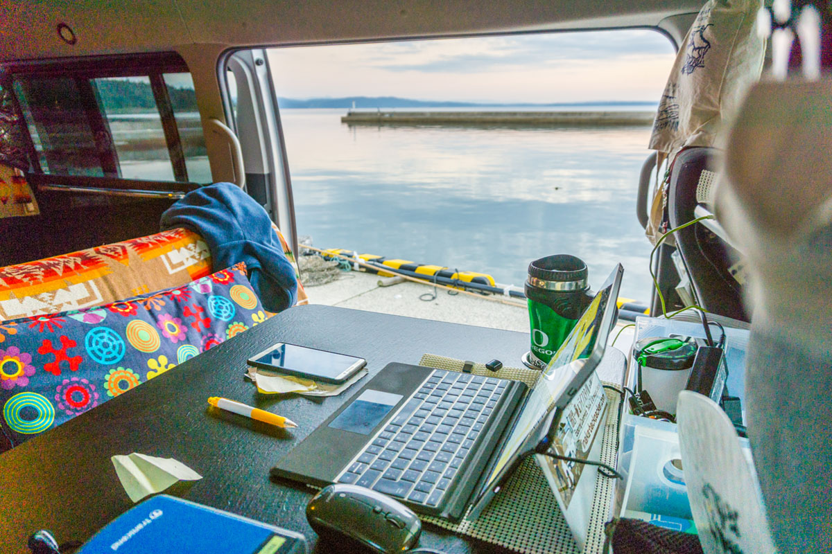 コロナ禍でリモートワークが増え、働く場所も選べる時代に。完全な個室で電気が使え、テーブルや椅子も備えたキャンピングカーは、自分だけの“動くオフィス”として使うのにぴったり!