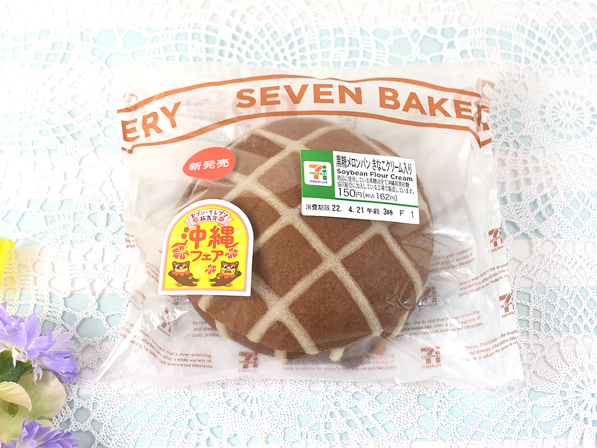 セブン-イレブンで展開中の「沖縄フェア」では、沖縄旅行の気分を味わえる黒糖を使ったスイーツやパンがラインナップ。「黒糖メロンパン きなこクリーム」も対象商品の一つで、茶色と白のクッキー生地で焼き目が表現された、なんともかわいらしいビジュアルの菓子パンです。クッキー生地に黒糖を使用しているだけでなく、黒糖蜜きな粉クリームをサンドしているのも特徴。パッケージを開けた瞬間に黒糖特有の深みのある甘い香りがふわりと漂ってきて、食べる前から沖縄らしさを感じます。