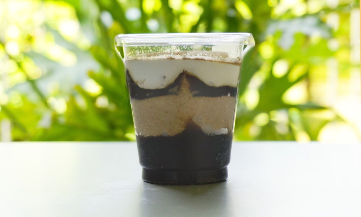 「和パフェ黒蜜きなこ」のカップは高さ約9センチ。横からみると、黒、茶、白、ベージュの層が重なり、太古の地球の鼓動を伝える地層の切断面のよう。下から黒蜜ゼリー・きなこムース・黒蜜ソース・ホイップクリーム・きなこ、と5つの素材が重ね上げられています。