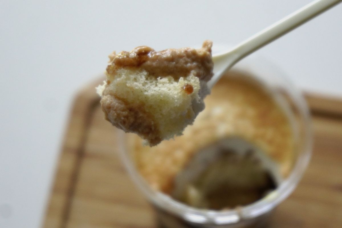 どの層までスプーンを差し込むかが考えどころですが、ふた口目は、きなこ、ホイップクリーム、黒蜜ソースの組み合わせで。横から眺めたときは、5層に見えた和パフェですが、上からスプーンで掘り進むと、ホイップクリームの下からしっとりと甘いスポンジケーキが出てきたり、ところどころにプチプチ、サクサクのパフが混ざっていたり……。新しい発見を求める発掘調査のように食べ進めます。
