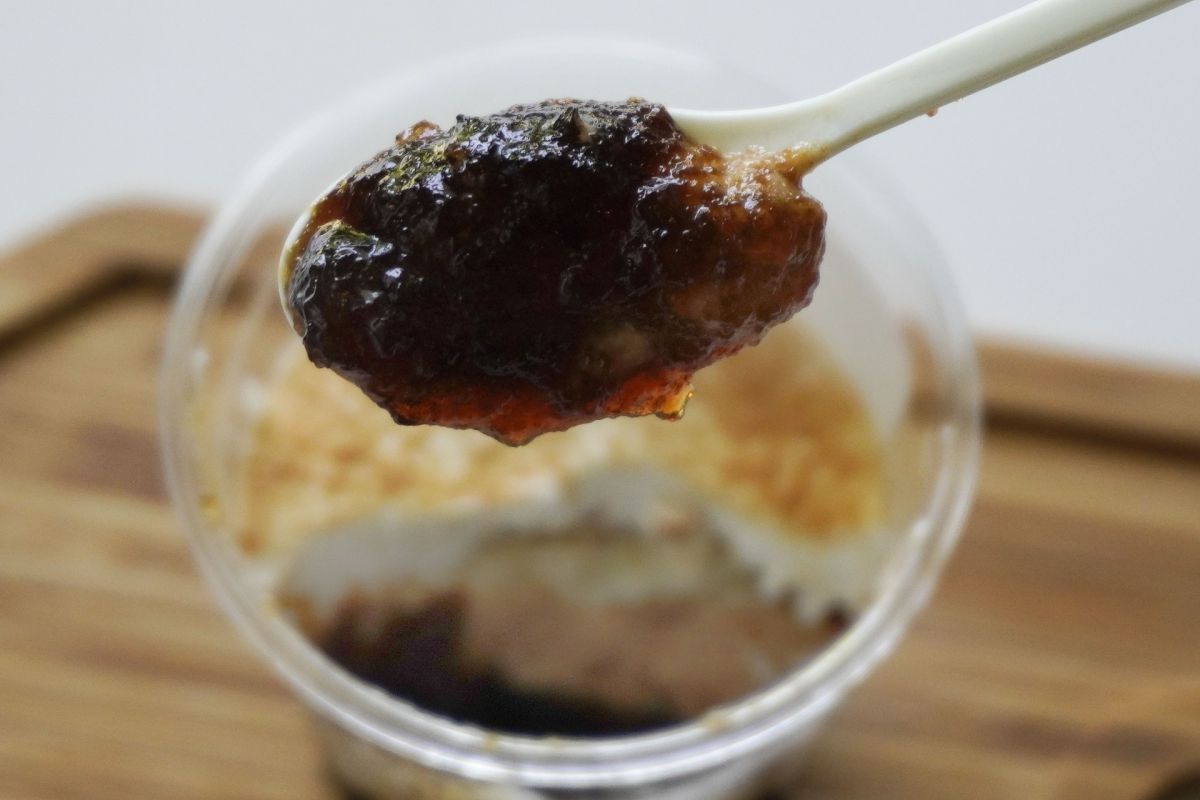 ついには一番下の黒蜜ゼリーの層までスプーンを差し込み、一体で味わいます。やさしい甘さの黒蜜ソースに、きなこの香ばしさを凝縮させたきなこムース。スプーンの上でふるふるとはかなげにゆれる黒蜜ゼリーは、黒糖を煮詰めた濃厚な甘さが際立ちます。