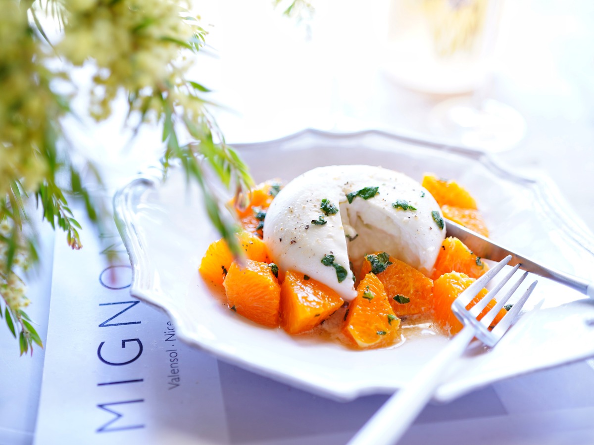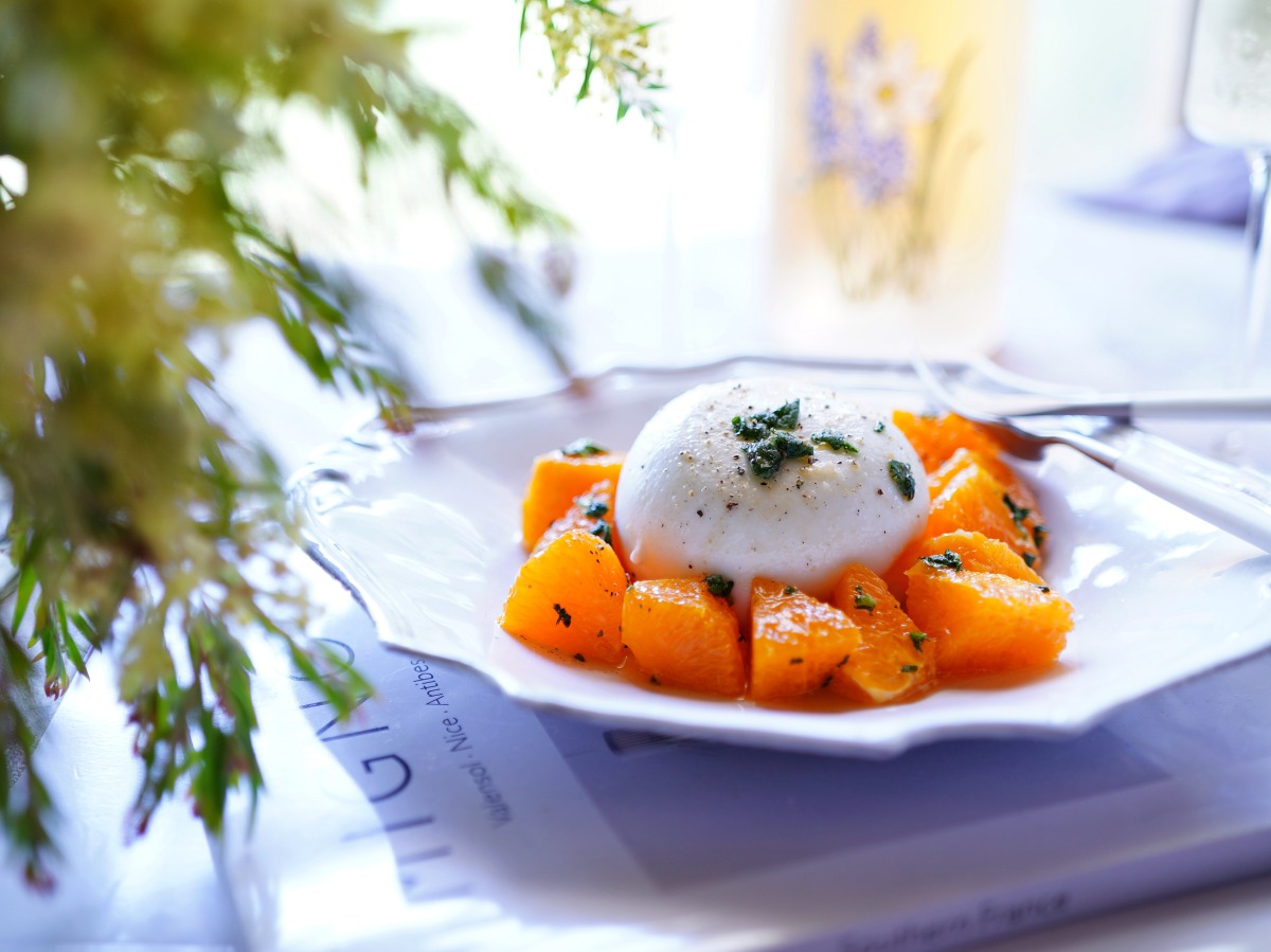ブッラータの周りにせとかのマリネを並べ、ミントを含むマリネ液の残りシロップを上からかけます。