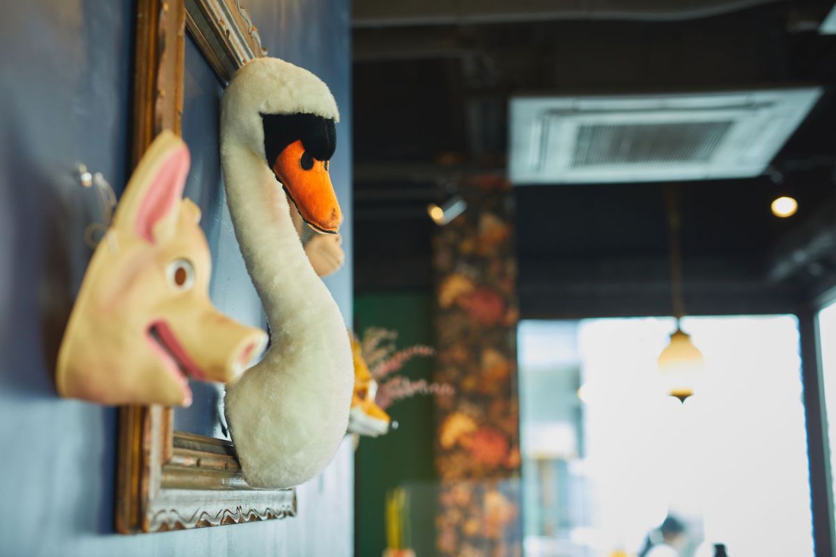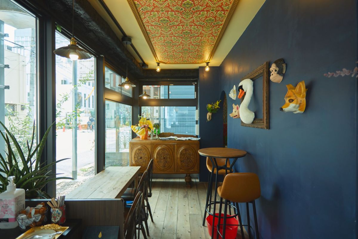 こちらは日が差し込む明るいカフェエリア。シックなネイビーの壁に動物のオブジェが映え、じつにユニーク!全14席あり、テーブル2席、カウンター9席、テラス3席が用意されています。