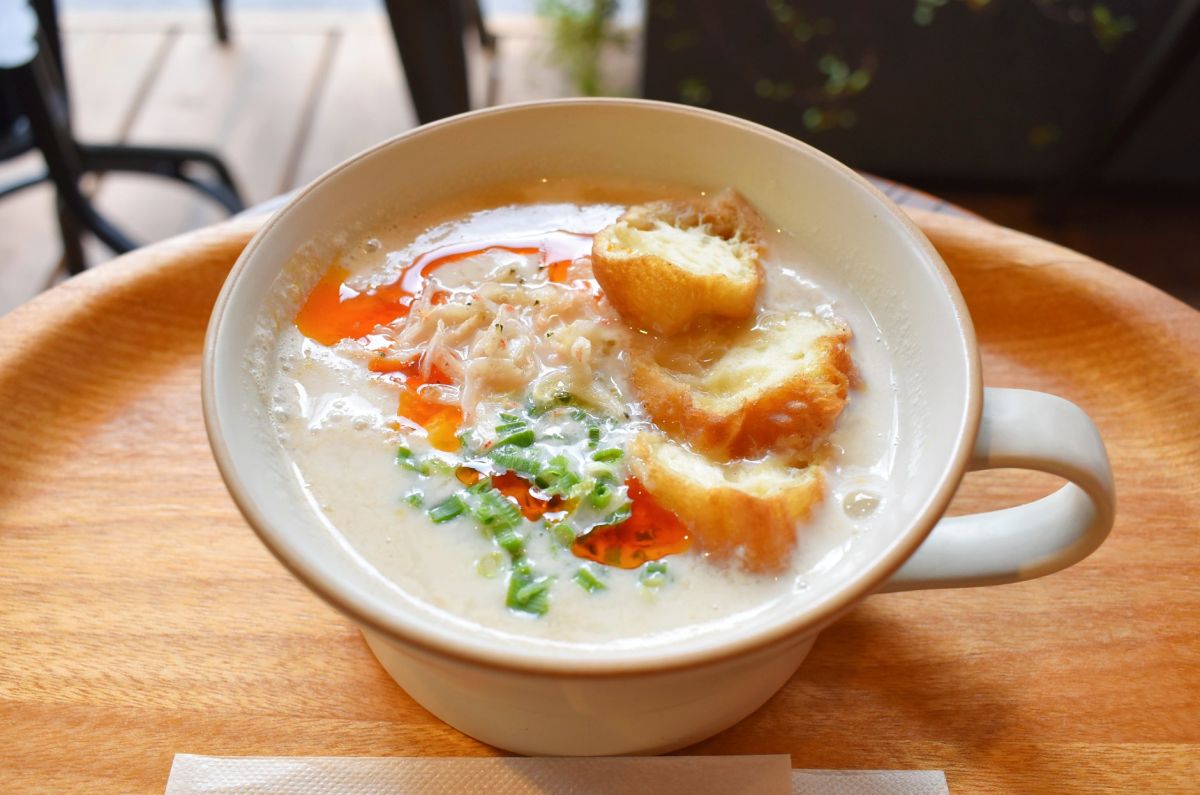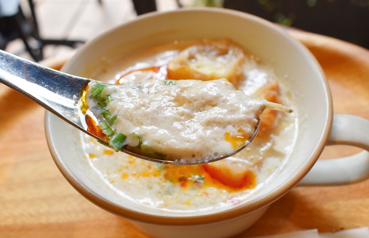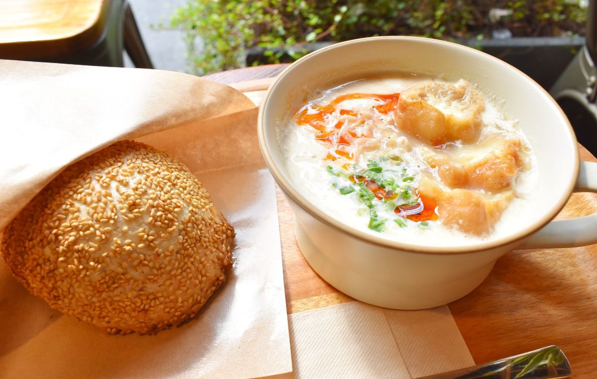 国産大豆100%の自家製豆乳を使った「鹹豆漿」は、台湾の朝ごはんとしてポピュラーな豆乳スープ。お酢で少し固まったふわふわ食感の豆乳に、中国風揚げパンの油条(ヨウティァオ)、干しエビ、ネギがトッピングされていて、食欲がないときにもサッパリといただけそうです。