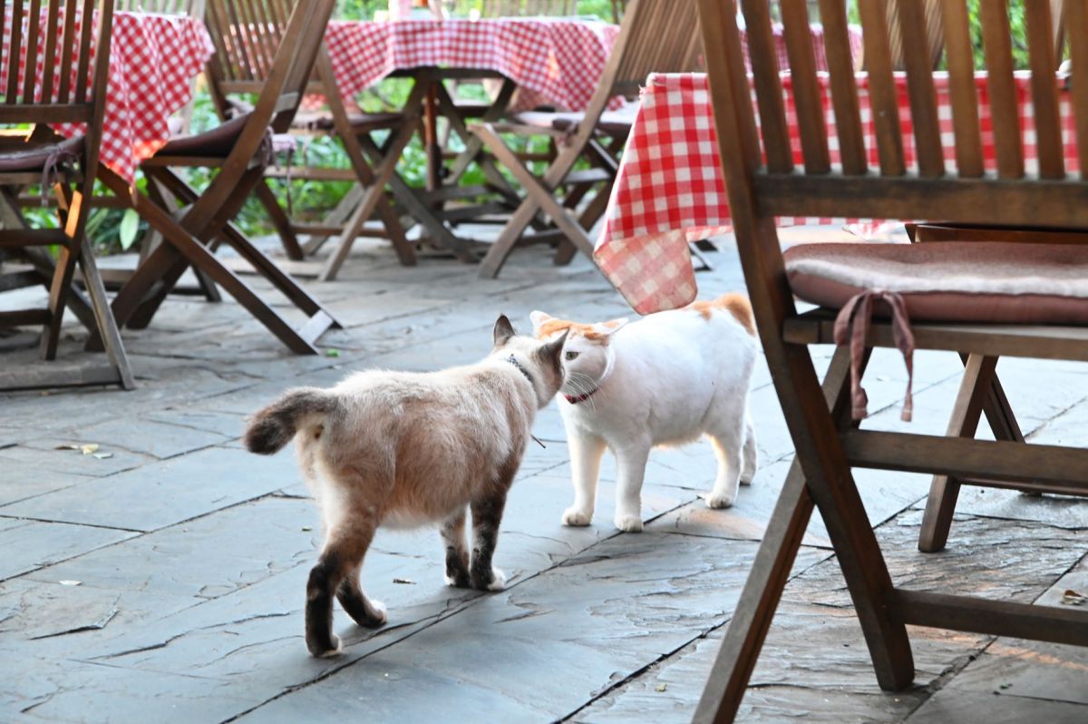 テレビ番組でも紹介され注目を集めているのは、ここで暮らしている猫たち。食事を楽しんでいる足元では、猫たちが自由気ままに過ごしています。写真撮影はいつでもOK、なかにはお客さんの膝の上のってしまう子も!