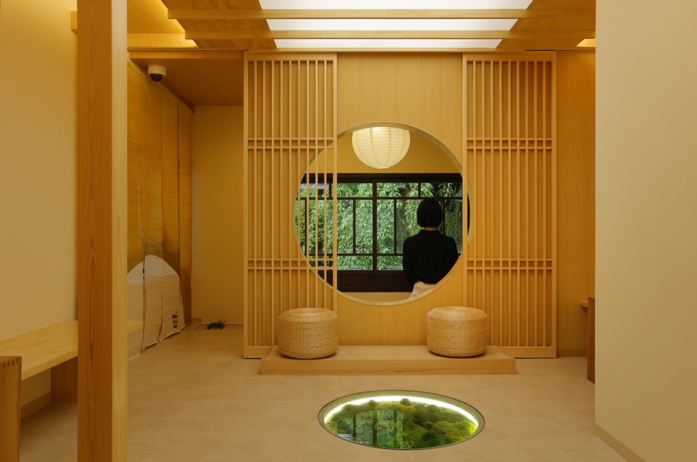 2階席もあります。丸いフレームや、床に配された苔アートがおしゃれで、窓からは産寧坂が見えます。春には目の前に桜が咲くのだとか。