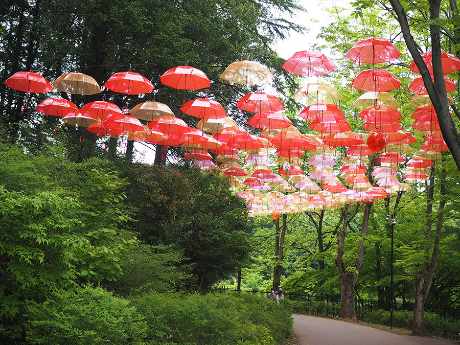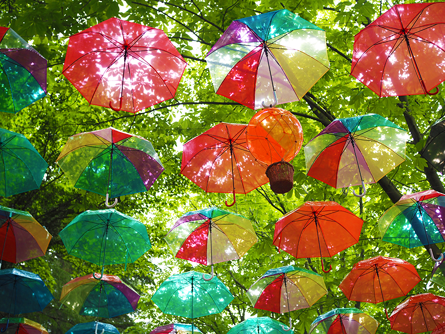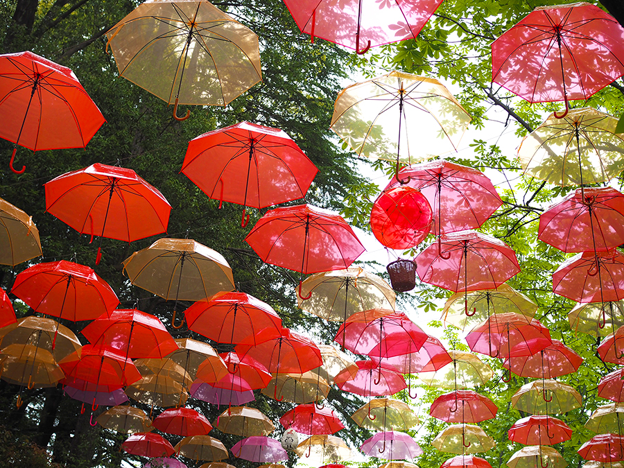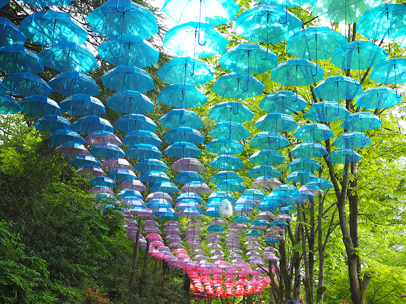 約200m、約1200本のアンブレラは日本最大級。カラフルな傘たちが木々のなかをずらっと彩る様子は、圧巻の美しさです。