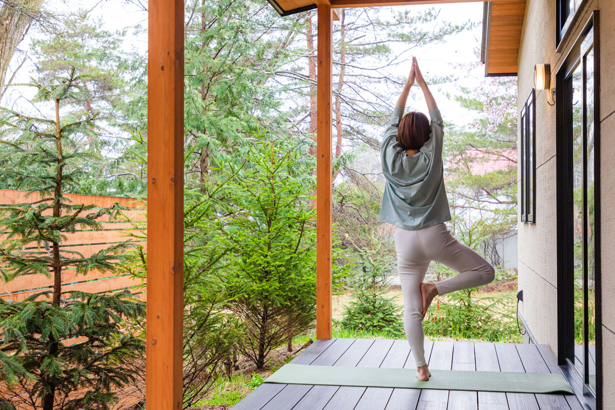 心地よい室内から一歩テラスへ出れば、木々を揺らす風の音や鳥のさえずりが。マットを持参してヨガや瞑想をしながら、自然の奏でる音に耳を傾けてみてはいかがでしょう。「GREEN SEED 軽井沢」のある追分は、歴史と自然が息づくエリア。徒歩圏内には、旧中山道の追分宿や、散歩コースとして知られる御影用水があります。歴史情緒あふれる街並みや、美しい自然を間近で感じながらのウォーキングもおすすめですよ!