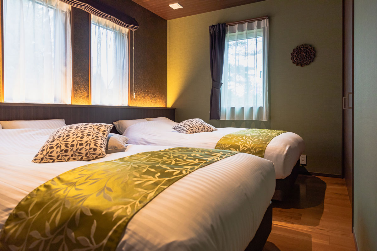 バスルームにも「癒し」が。バスタブは、ネックレストの部分からお湯が流れ落ち、首と肩をやさしくマッサージしてくれる肩湯機能を備えているので、まるでスパにいるような心地よさ。湯上りは、今治タオルの肌触りを楽しみながら、徐々に安眠モードに。シモンズ製のベッドが快眠を約束してくれます。目が覚めたら、高原の清々しい朝の空気を深呼吸!きっと、心も体もリフレッシュしているはず。