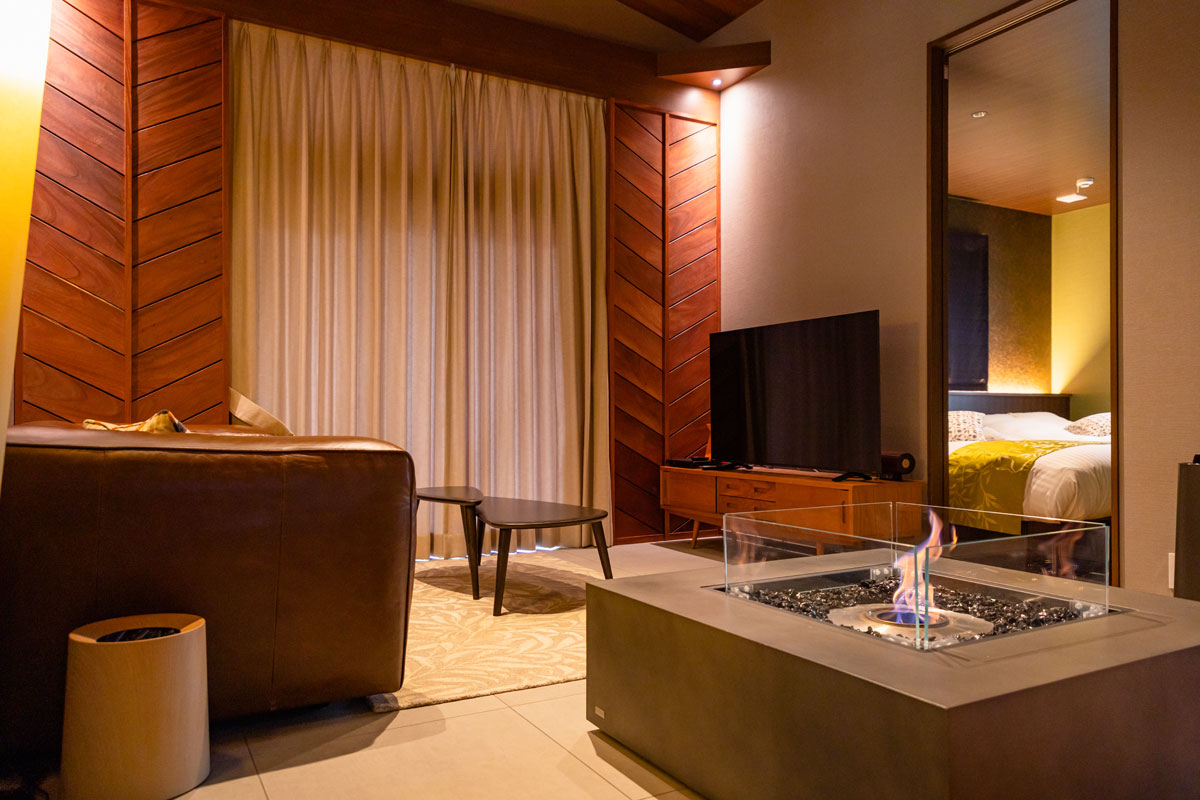 食後は、バイオエタノール暖炉・エコスマートファイヤーを囲んで、ゆったりおしゃべり。ゆらめく炎は見ているだけで不思議と癒されます。Bluetooth対応のスピーカーでお気に入りの曲を聞いたり、シアタールームで映画を鑑賞したり。エコスマートファイヤーやスピーカー、シアタールームも全棟に完備されているんです!