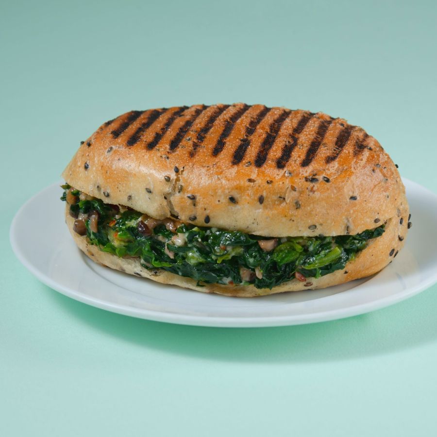 イタリアの“バール”をコンセプトとしたカジュアルカフェ「ANTICO CAFFÈ AL AVIS(アンティコカフェ アルアビス)」のパニーニ「スピナッチ」560円は、バンズからフィリングまで、すべて手作り。ホウレンソウ、ベーコン、4種のキノコを自家製マヨネーズで和え、自社工房で焼き上げた黒ゴマ入りバンズにサンドしています。