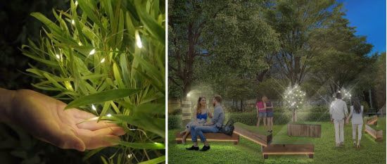 また、こちらのエリアでは、夜になるとホタルのようなやさしい光がベンチの木に灯り、日中とは異なる雰囲気に! 幻想的でロマンチックな空間は、デートにもぴったりです♪