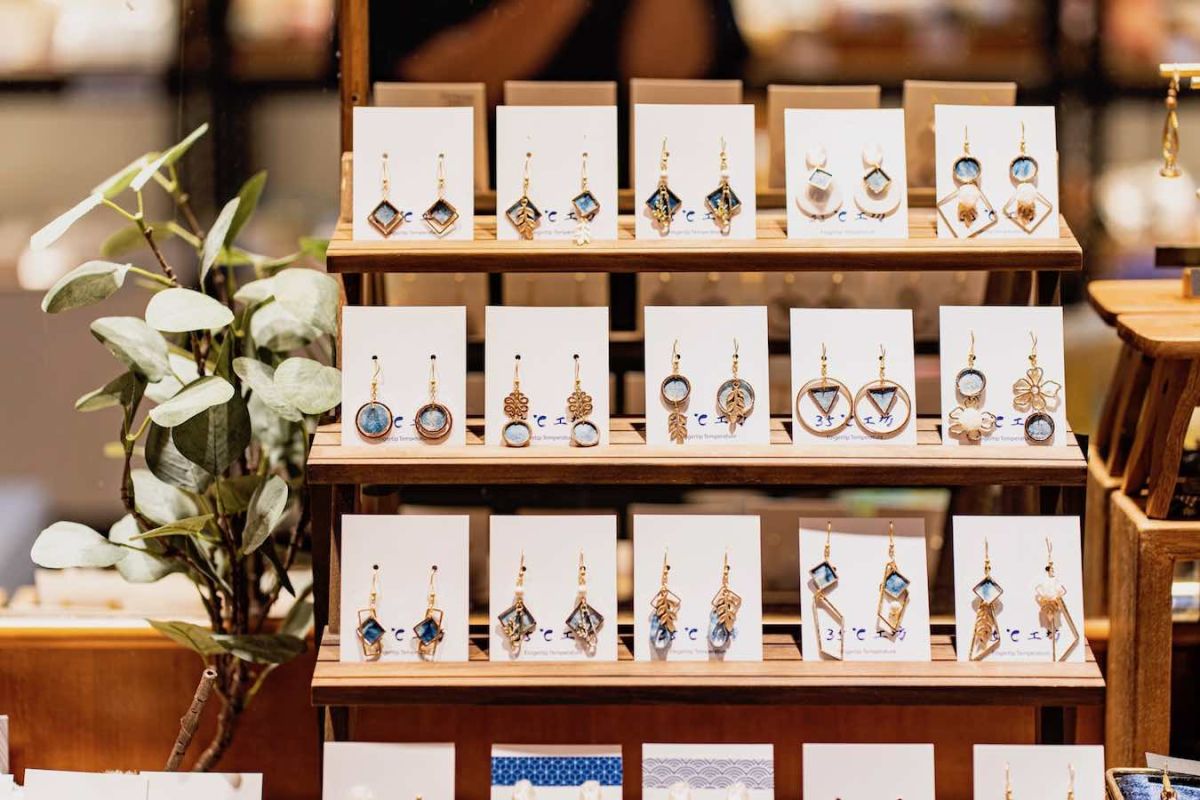 藍色の柄を焼き付けた陶磁器と銅の組み合わせが目を引く、「35℃工坊」のハンドメイドピアス。ノスタルジックな雰囲気が漂うデザインで、身につければ台湾旅行のステキな思い出にしっとりと浸れそう。