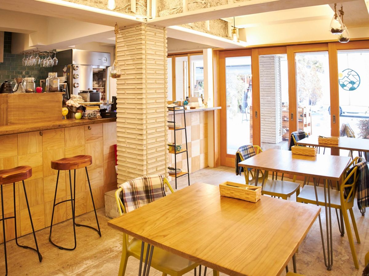 庭側から見た店内の風景がこちら。“海・山・太陽”をモチーフに、海外のカフェを思わせるオシャレな空間に仕上がっています。これからの季節、テラス席を利用するものいいですね。