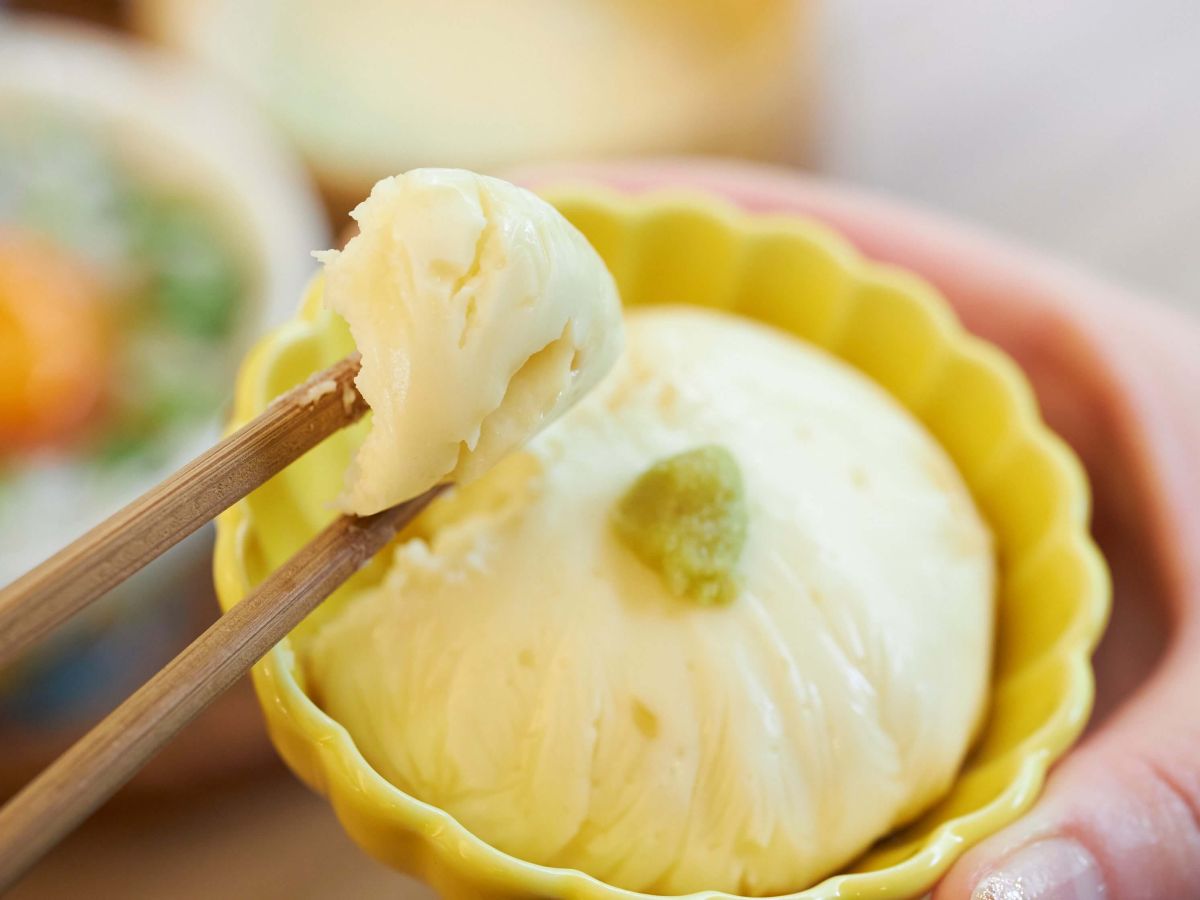 こちらが「豆乳とクリームチーズのお豆腐」。ぷるっぷる&もっちりとした濃厚なお豆腐なのですが、クリームチーズを練って作っているのでそのままで食べるとデザートのような甘さなんです。ワサビやだしじょうゆと一緒に口にすると、和風のおかずに大変身するという何とも驚きのひと品!くせになるおいしさとは、まさにこのことです。