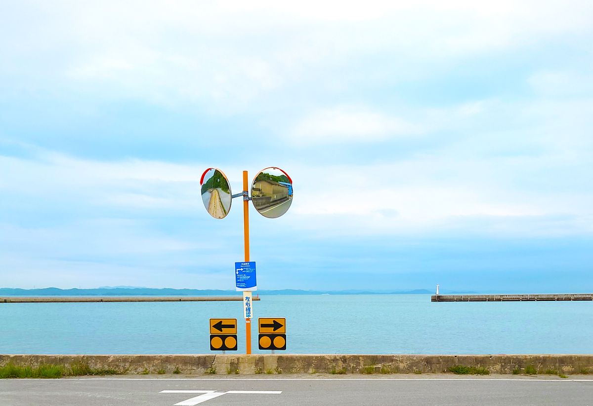 その道を降りると、三叉路に突き当り、海を背景にカーブミラーが2つ並んでいます。こちらが2つ目の絶景スポット。海がワイドに見え、双子のカーブミラーも相まって、フォトジェニックな景観を作り出しています(上記2カ所とも車道に立ち入っての撮影は禁止)。