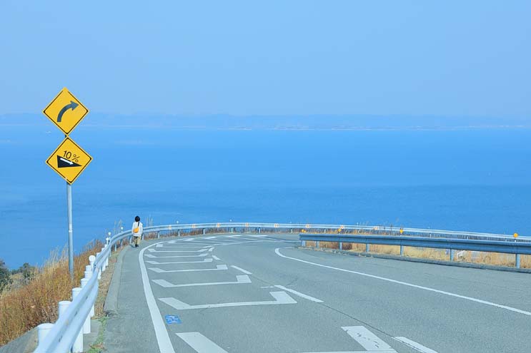 「豊島美術館」の近くには、SNSで有名な絶景スポットが2つあります。まずは、海へ向かう坂道へ。急勾配の坂道が大きくカーブし、その先に海がどこまでも広がっています。