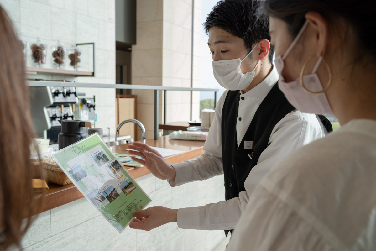 「全景の茶の間」へ向かうには、まず日本平山頂にある日本平ホテルへ。1階にあるテラスラウンジで受付を行い、「茶の間」への道のりの説明を受けたあと、茶葉や急須などのセットが入ったバッグを受け取ります。