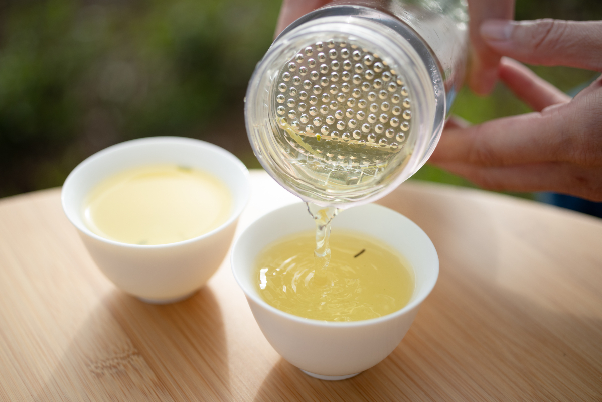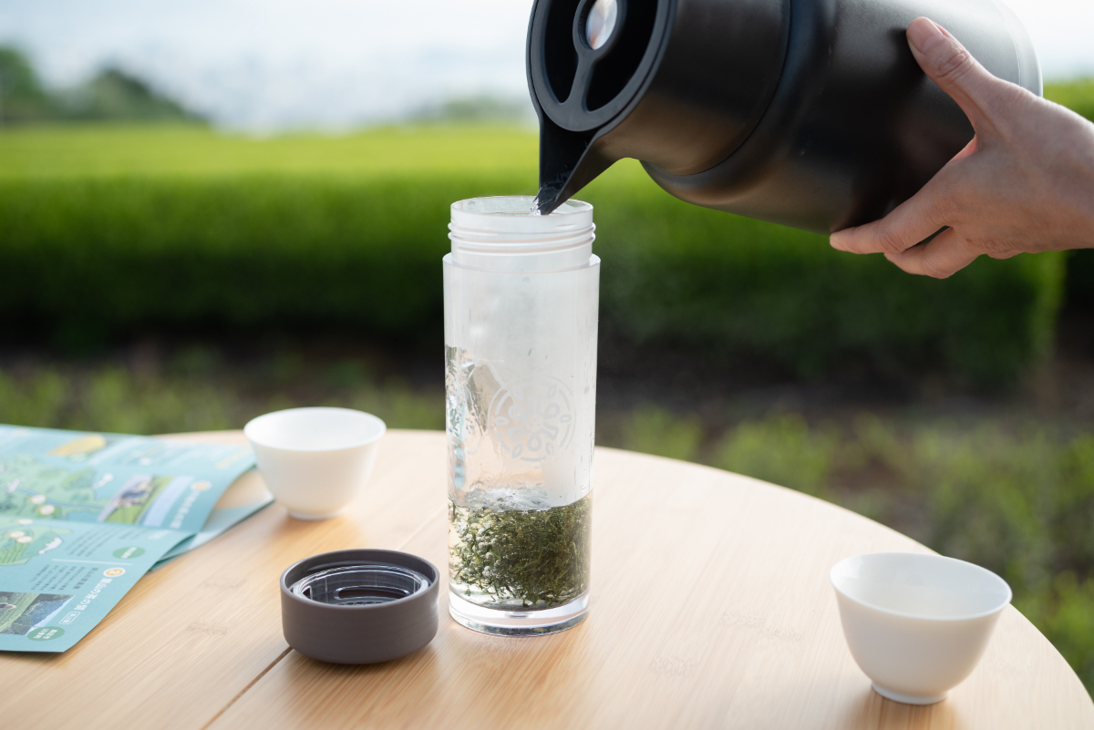 お茶菓子をかじりつつ、煎茶も淹れてみましょう。茶こしが一体型となったボトルに茶葉とお湯を入れると……