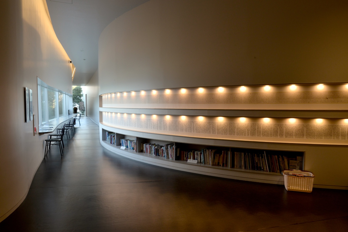 新館2階展示室から本館(旧館)へ向かう渡り廊下沿いには、熊楠が書いた全長約8m、文字数5万8000字の「世界一長い履歴書」といわれる展示があり来訪者を驚かせます。豊かな自然の風景を望む窓辺には椅子が並べられて、集められた熊楠関連の書籍を眺めながらゆったりと時を過ごすこともできます。