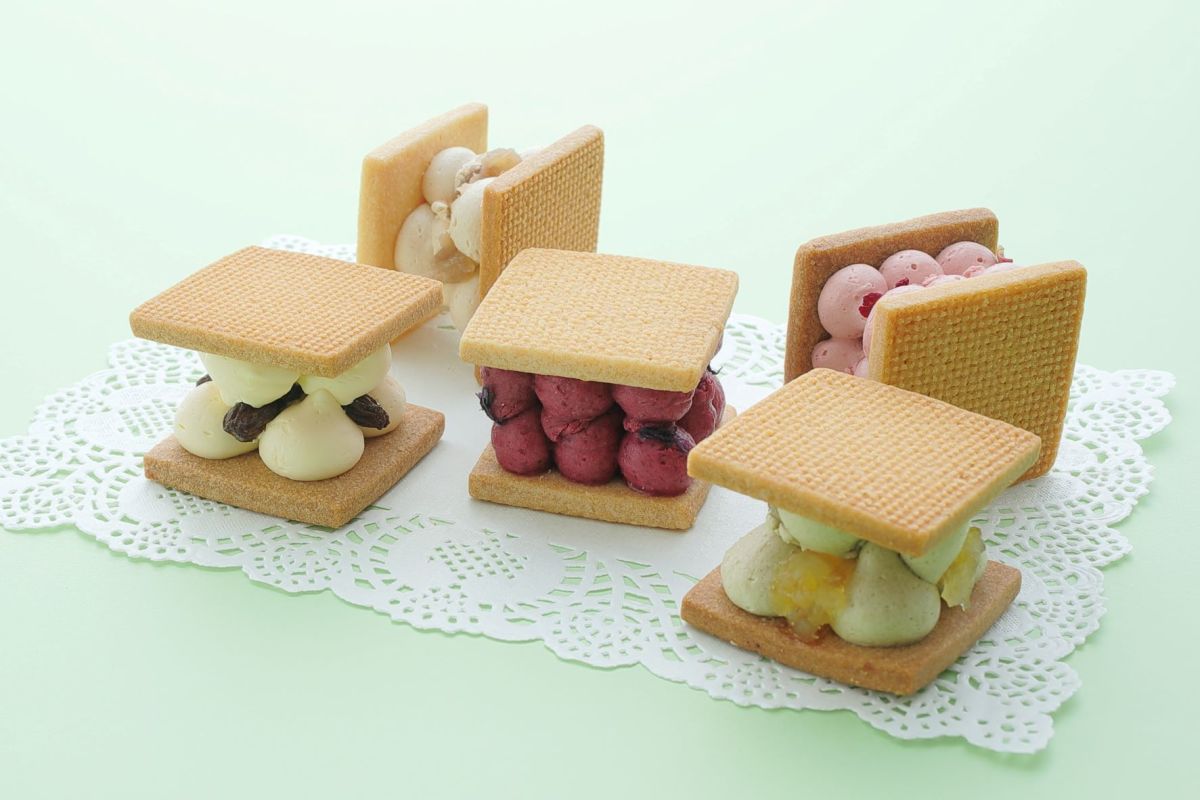 外側の生地は、焼いた方が香ばしさが生きるという、フランス産の発酵バターを使用。石臼で挽いたフランス産の未精製の小麦、アーモンドパウダーとともに、サクッとした食感と素朴な香ばしさを生み出しています。また生地にはフランス・ゲランド産の塩を粒を残して使うことで、バタークリームの控えめな甘さをしっかり引き立てています。じつは西園氏はバター使いに定評があり、そんなパティシエの代表作がこのバターサンドなのです。